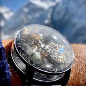 “I wore the regular Astronomia Tourbillon on my last climb to the Himalayas, where I went up to 6,200 meters (almost 20,000 feet), in -30 C degree, extreme conditions,” Nilson says. “I used the Astronomia on the climb in order to test it. You would think that such a complicated watch would be delicate and fragile, but it isn’t, and it performed perfectly in all conditions. I used it climbing up ice walls, with my ice ax, banging it against rock and ice and it held up extremely well.”